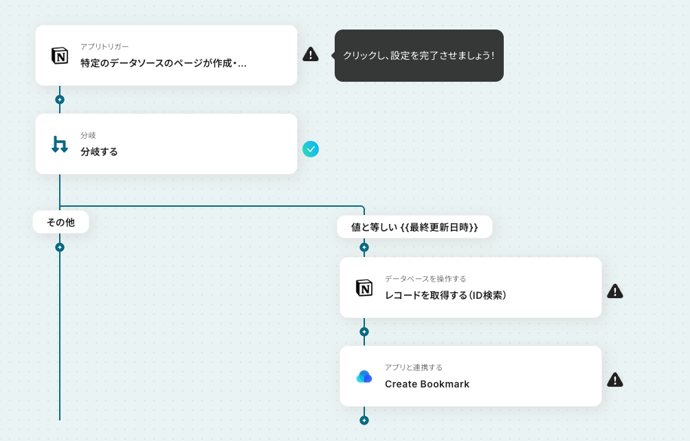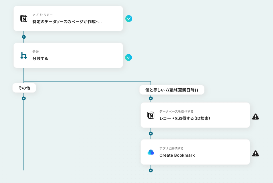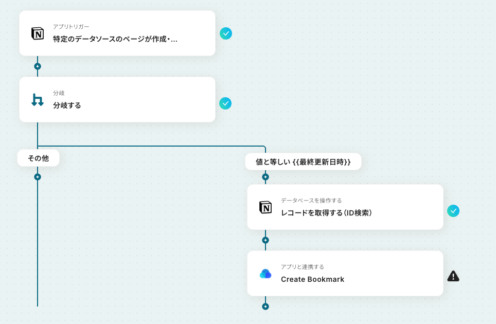 今回のフローにおいて、Notionのトリガーは「特定のデータソースのページが作成・更新された」ときに起動します。 そのままでは既存レコードを更新した場合にもフローが動いてしまうため、不要なブックマークの作成が発生してしまう可能性があります。 そこで「作成日時」と「最終更新日時」が等しいことを分岐条件として指定し、ページが新規作成された場合にのみフローが起動するよう設定します。
