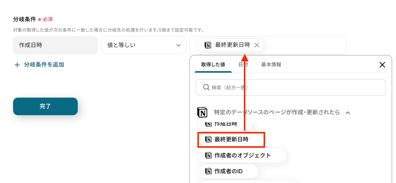 分岐条件 「作成日時」「値と等しい」が選択されていることを確認しましょう。 右の値には「最終更新日時」を指定します。 最終更新日時はデフォルトで設定されていますが、誤って消してしまった場合などは、画像のとおり入力欄をクリックすると前のステップでNotionから取得した値が表示されます。 その中から「最終更新日時」を選択してください。 取得した値を活用することで値が固定化されず、フローボットを起動するたびに最新の情報を自動で反映できます。