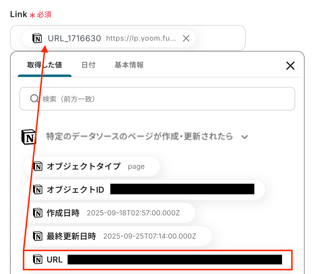 Link 入力欄をクリックすると、前のステップでNotionから取得した値が表示されるので、選択して入力しましょう。 取得した値を活用することで値が固定化されず、フローボットを起動するたびに最新の情報を自動で反映できます。 なお、テキストを直接入力した部分は固定値とされるため、取得した値を活用せず設定を行うと毎回同じデータがRaindrop.ioに登録されてしまうので注意が必要です。