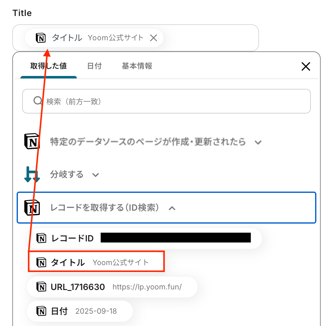はい、Notionで設定したタグやプロパティもRaindrop.ioに連携可能です。 Yoomの「レコードを取得する」アクションで、Notionページに設定された「タグ」や「プロパティ」を取得できます。 取得したデータは、Raindrop.ioの「Create Bookmark」アクション内の各項目(例:Tags, Important, Excerpt, Note など)にマッピングすることで、URLやタイトルだけでなく、カテゴリや補足情報も自動的に反映できます。