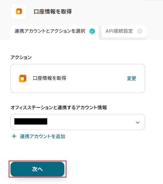 - 続いて、オフィスステーションの「口座情報を取得」アクションで、従業員の口座情報をすべて取得します。