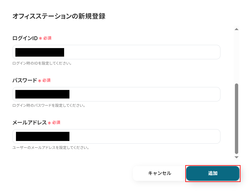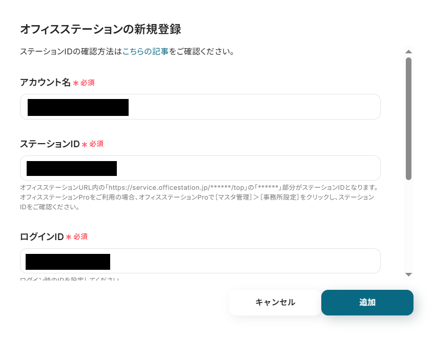 表示内容を確認しながら、アカウント名、ステーションID、ログインID、パスワード、メールアドレスをそれぞれ入力したら、追加をクリックしてください。