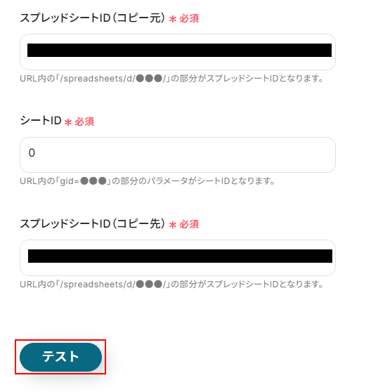 ※テストをクリックすると実際にシートがコピーされます。
