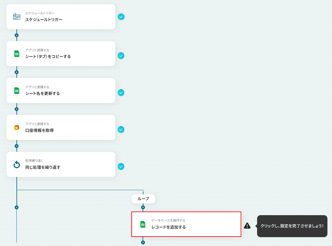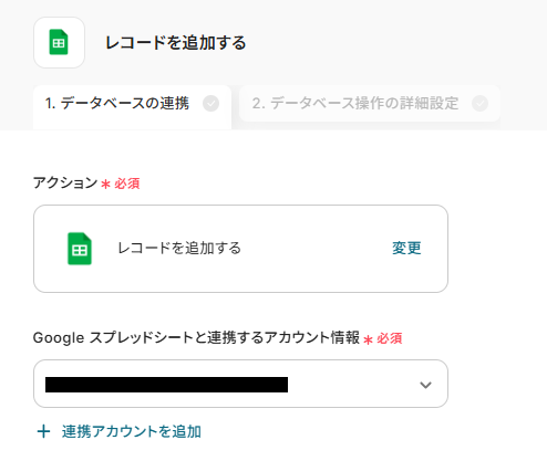 - 最後に、繰り返し処理の中でGoogle スプレッドシートの「レコードを追加する」アクションを設定し、情報を1行ずつ追加します。