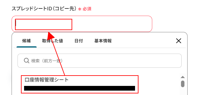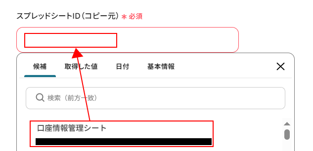 入力欄をクリックし、表示された候補の中からコピーしたいシートがあるスプレッドシートを選択してください。