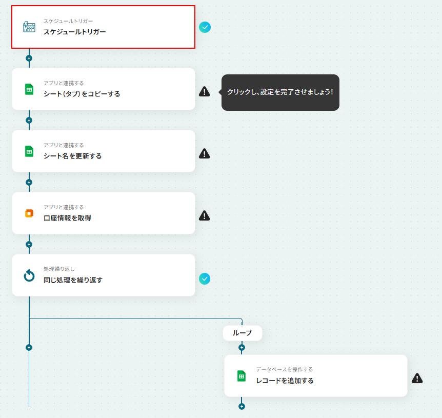 - スケジュールトリガーの設定と各アクション設定