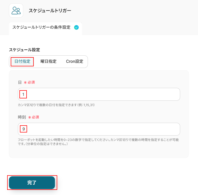 今回はデフォルトで設定されている日付指定を使用し、毎月1日の朝9時に起動するように設定しました。