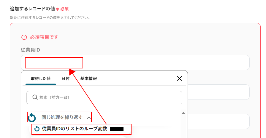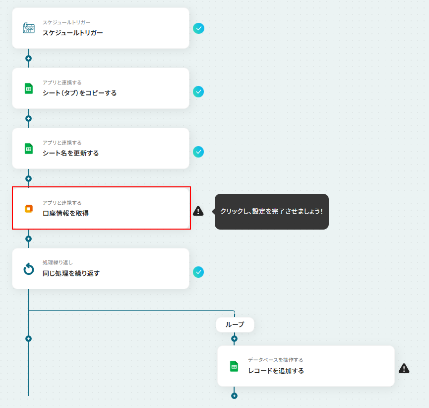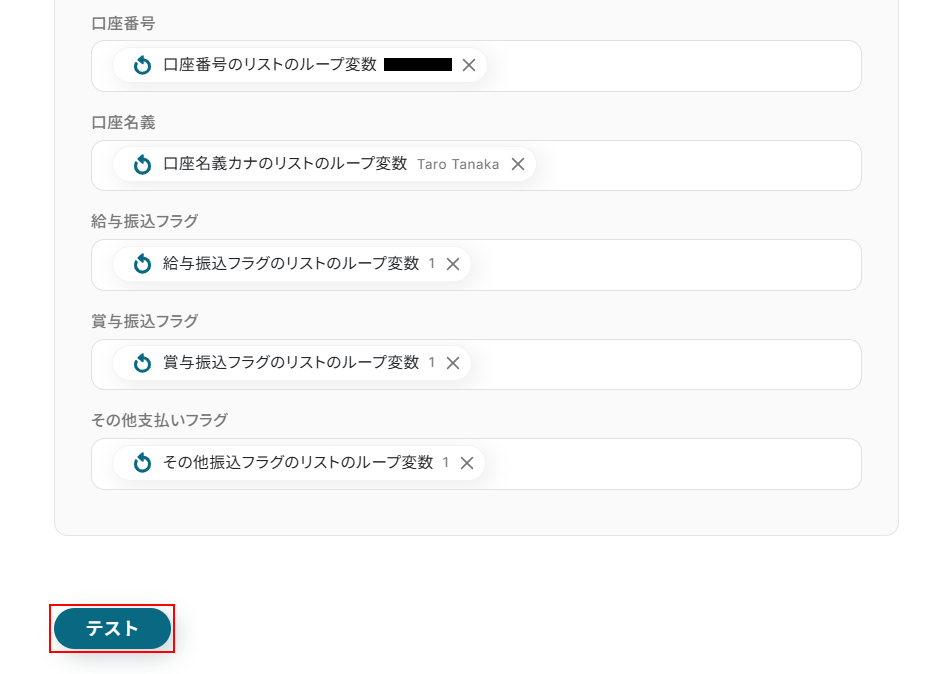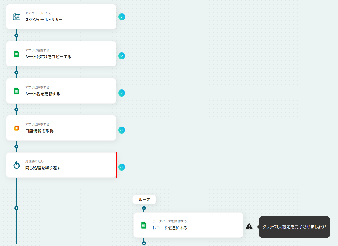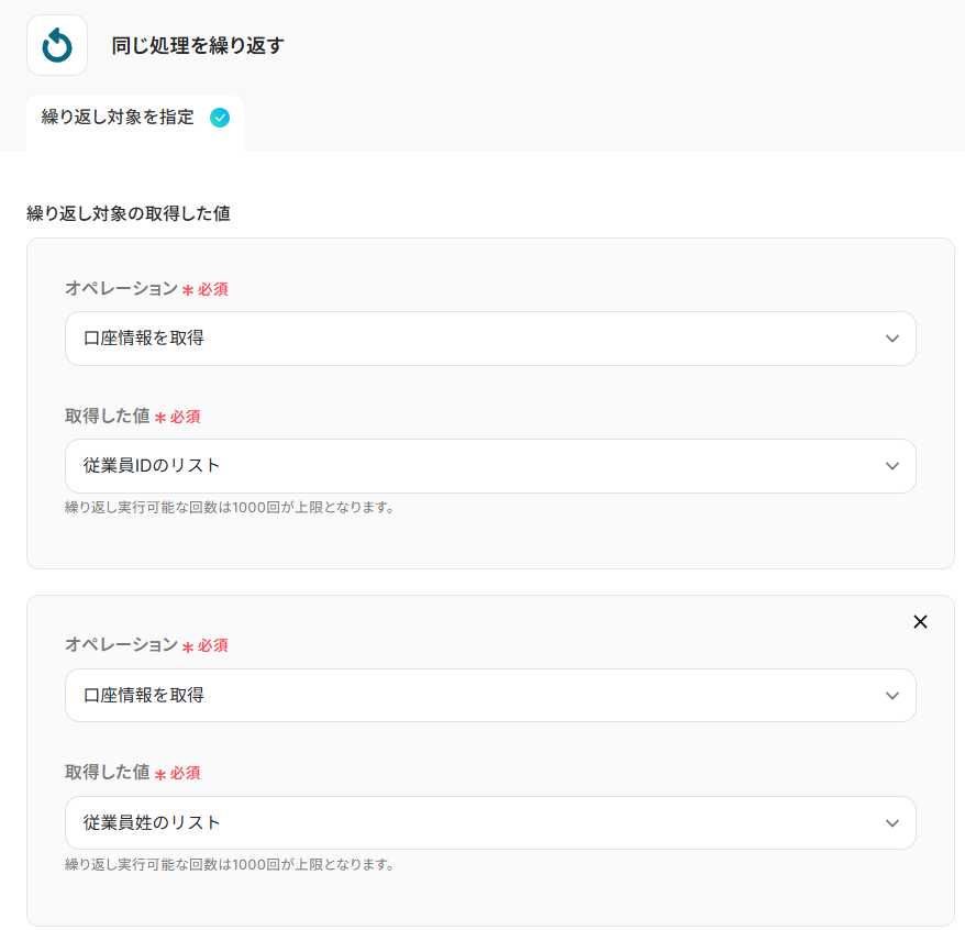 - 次に、「同じ処理を繰り返す」を設定し、取得した全従業員の口座情報に対して繰り返し処理を行います。