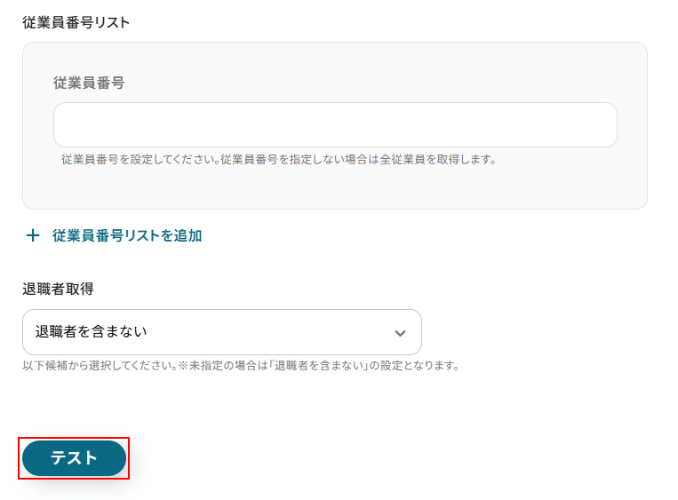 - freee人事労務の「従業員情報の取得」アクションでは、トリガーで取得したアウトプット(従業員IDなど)を活用して、対象の従業員情報を指定してください。