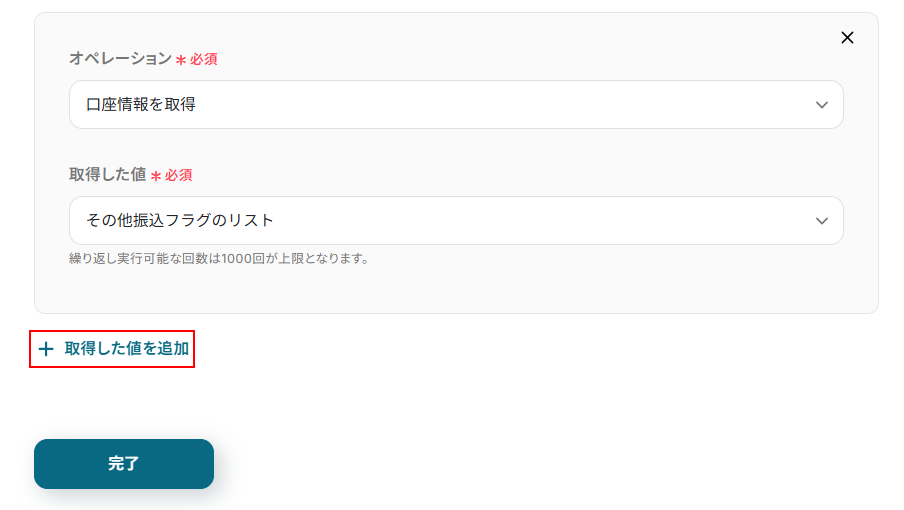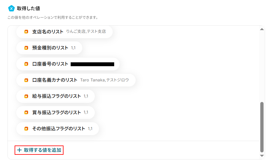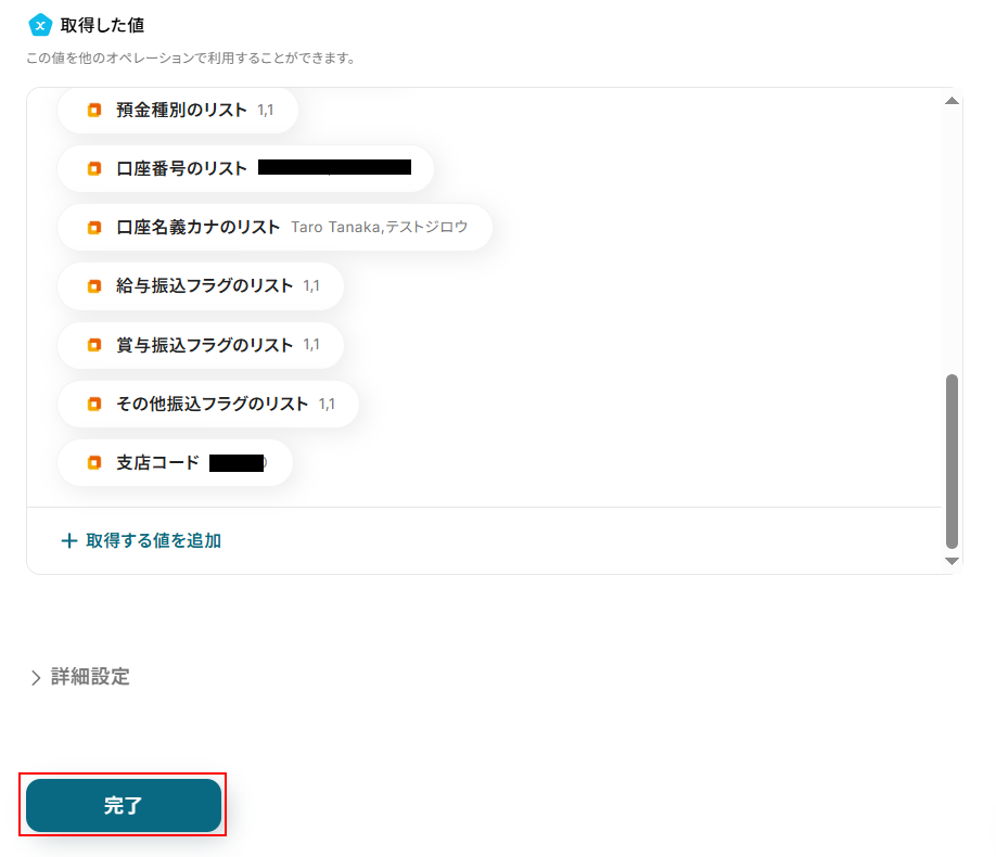 取得した値は実行した結果が設定される動的な値として利用できるため、このあとの設定でも使用します。