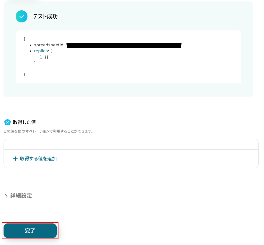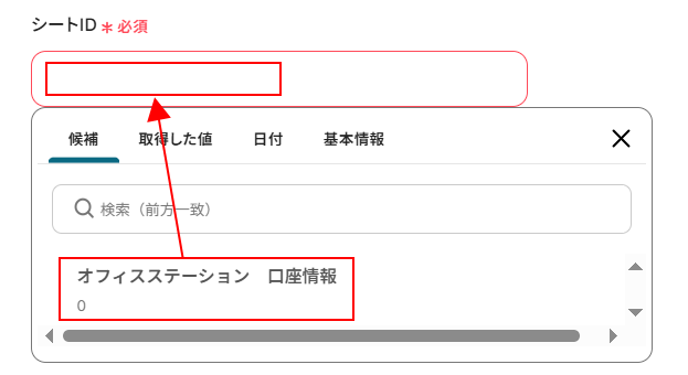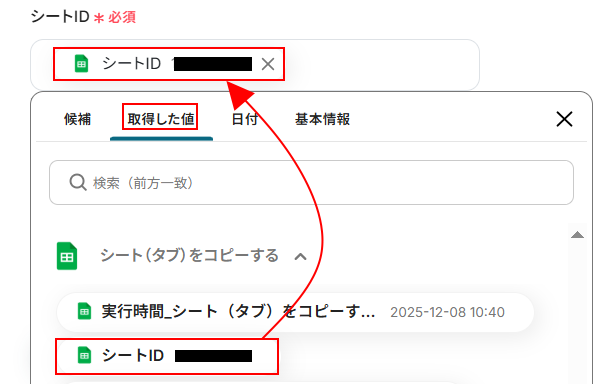 シートIDにはデフォルトで取得した値が設定されていますので、項目名と値が表示されているか確認してください。