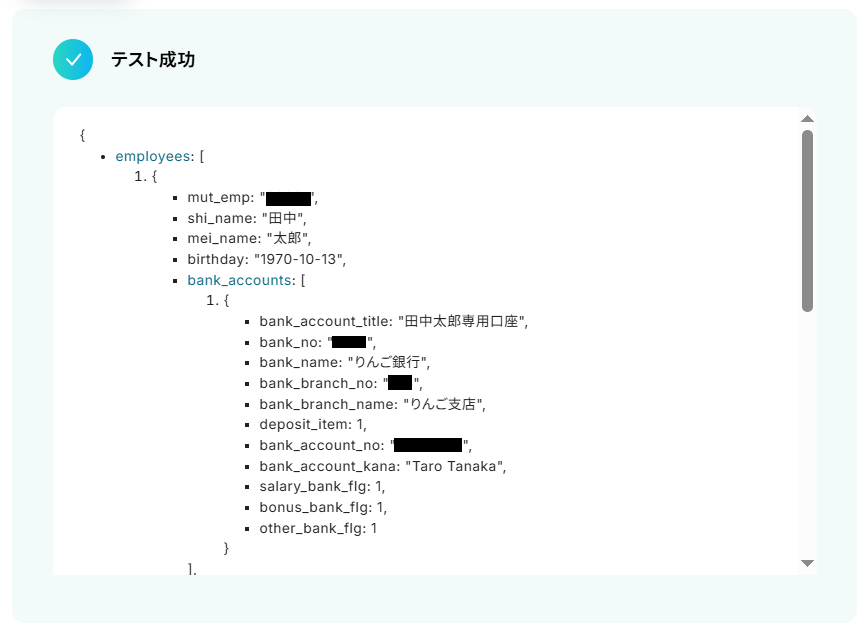 テストに成功するとテスト成功画面が表示され、取得した値が表示されます。