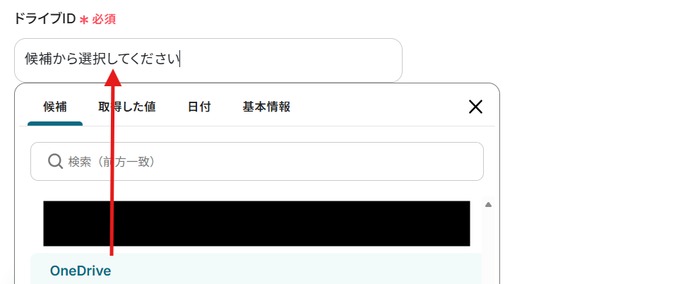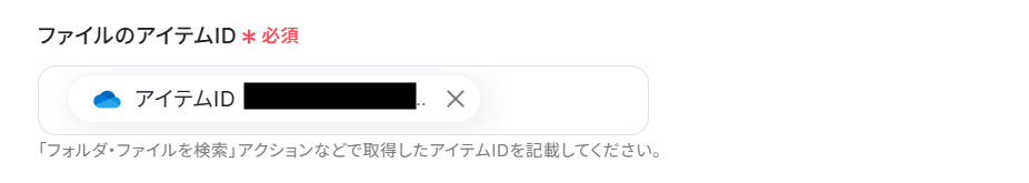 - 次に、オペレーションでOneDriveの「ファイルをダウンロード」アクションを設定する