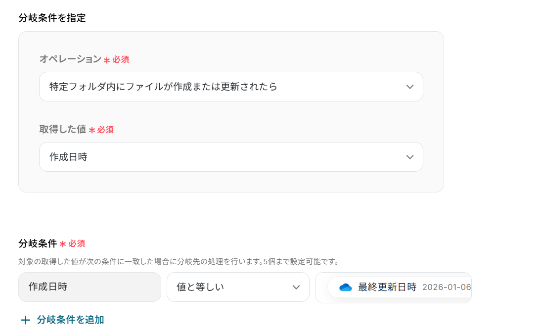 - 次に、オペレーションで分岐機能を設定し、新規ファイルの場合のみ後続の処理を実行するように設定する