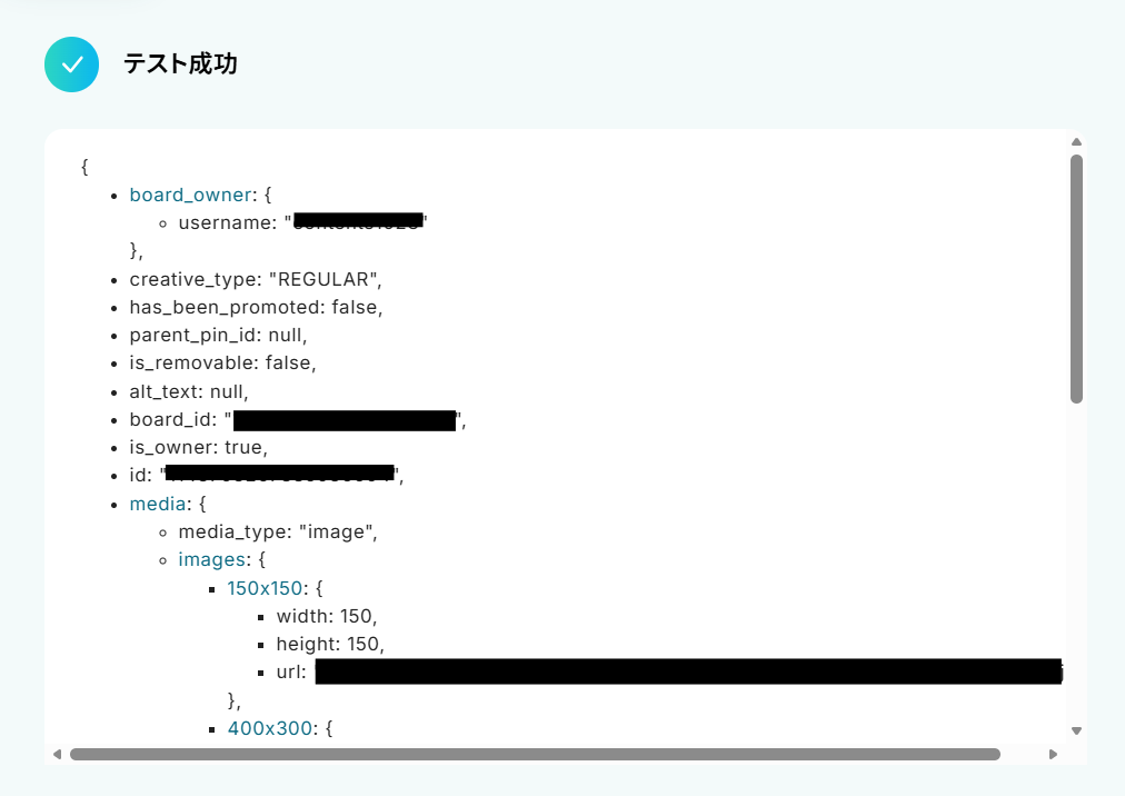- Pinterestの「Create Pin」アクションでは、ピンを追加したいボードのIDや、コンテンツの種類(Content Type)を任意で設定してください