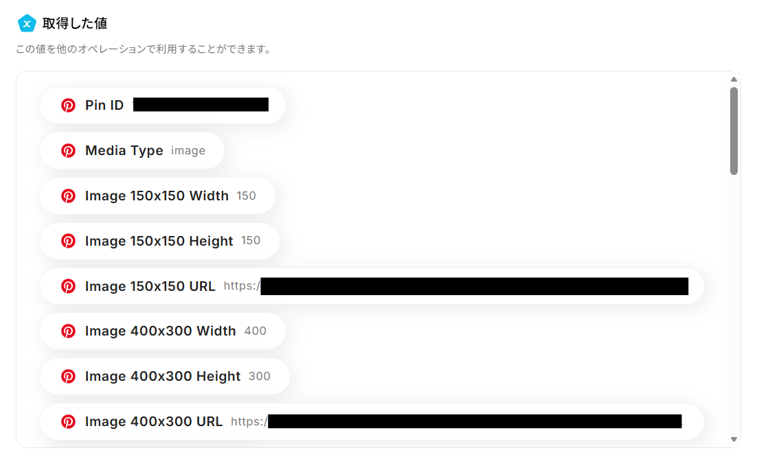 - 最後に、オペレーションでPinterestの「Create Pin」アクションを設定し、ダウンロードしたファイルをもとにピンを作成します