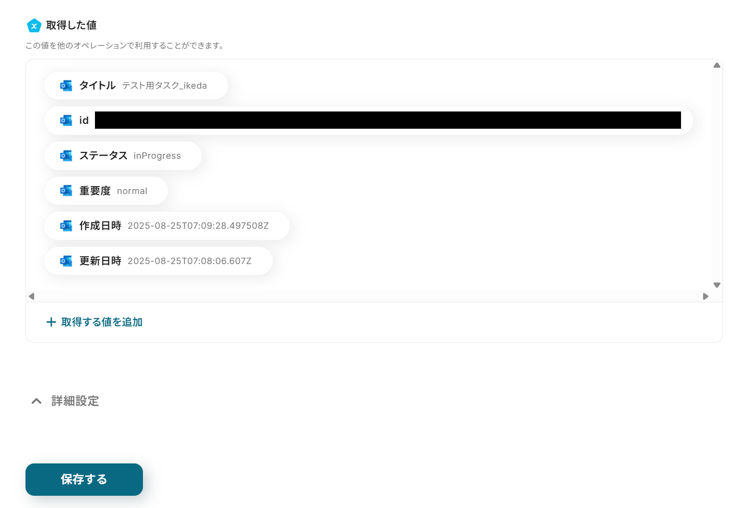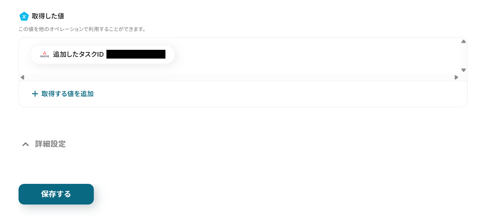 テスト結果に問題がなければ画面下の保存するボタンをクリックし、Asanaへタスクを追加する設定を完了させてください。