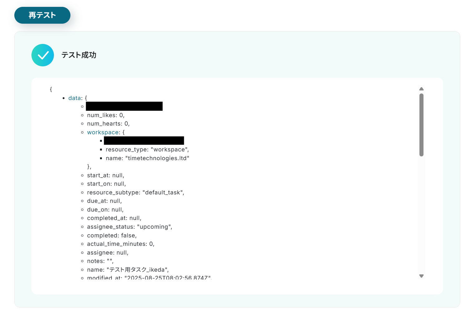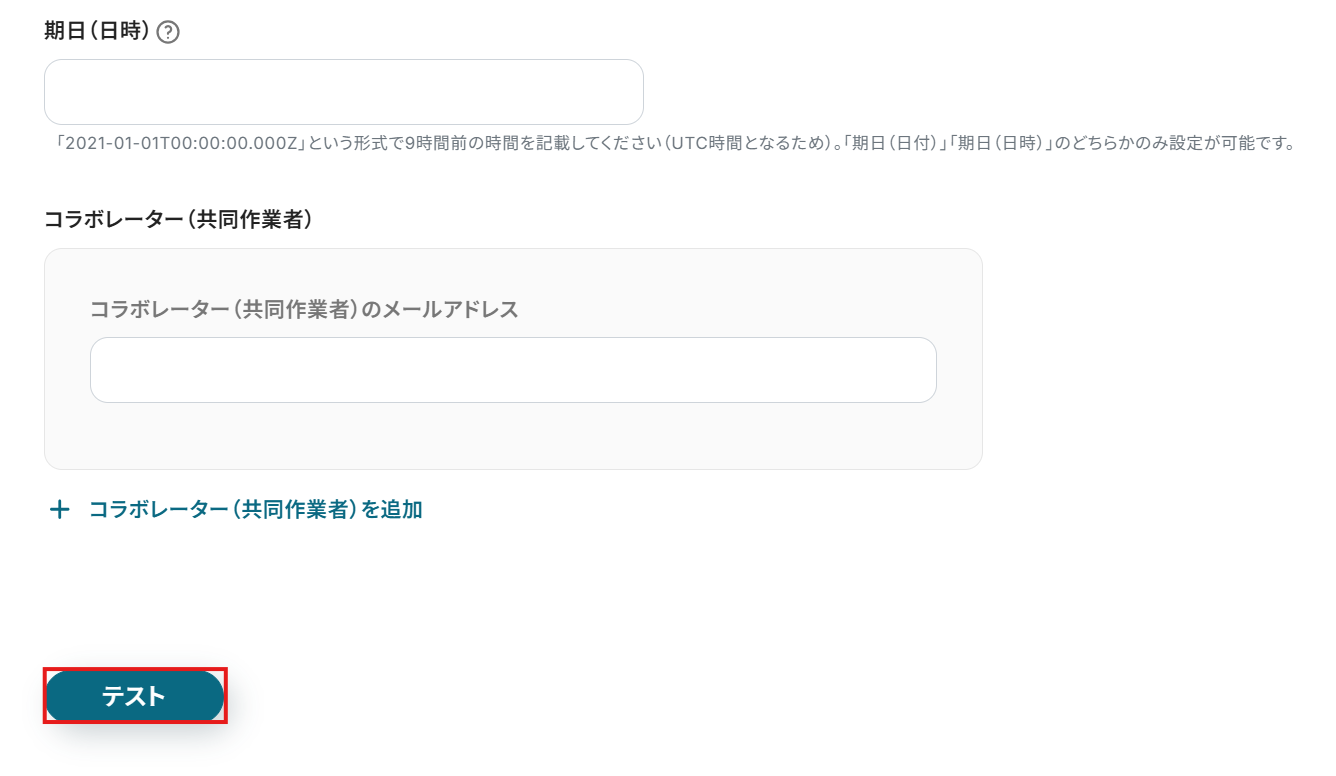 その他の項目については任意で入力を行ってください。設定が完了したらテストボタンをクリックしましょう。(実際にAsanaにタスクが作成されます)