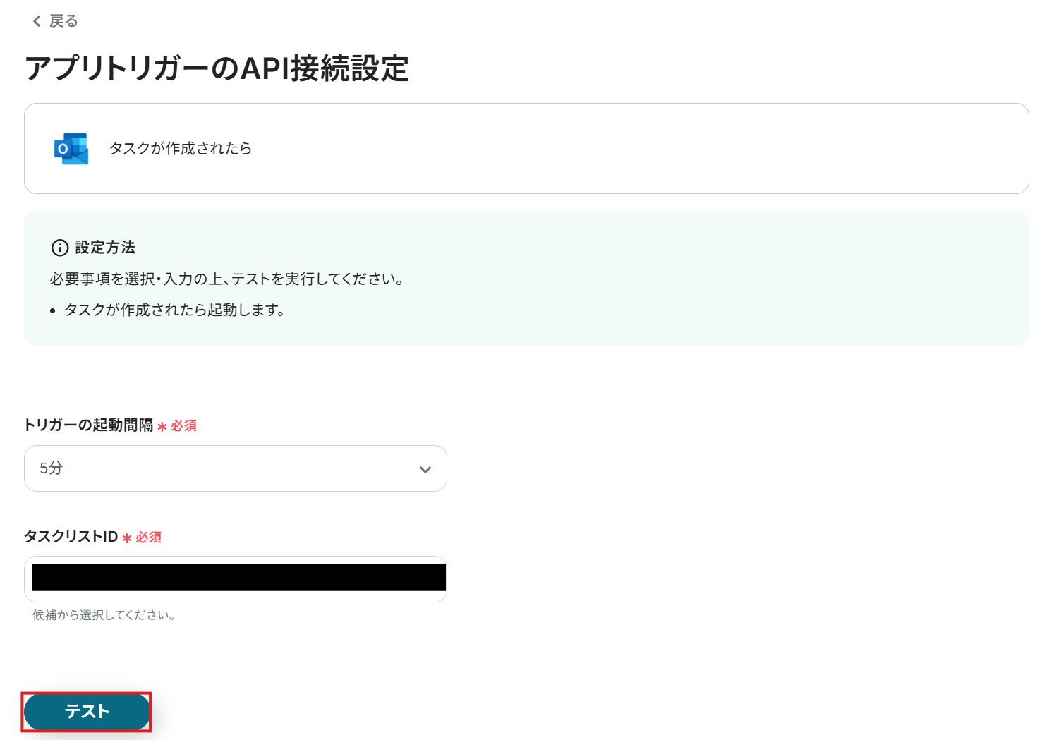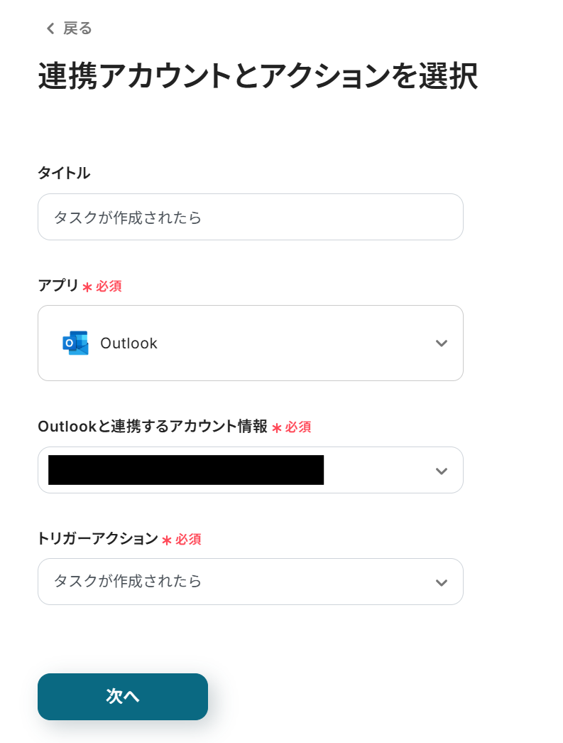 「アプリトリガーのAPI接続設定」画面ではOutlookから作成したタスクを取得する設定を行います。