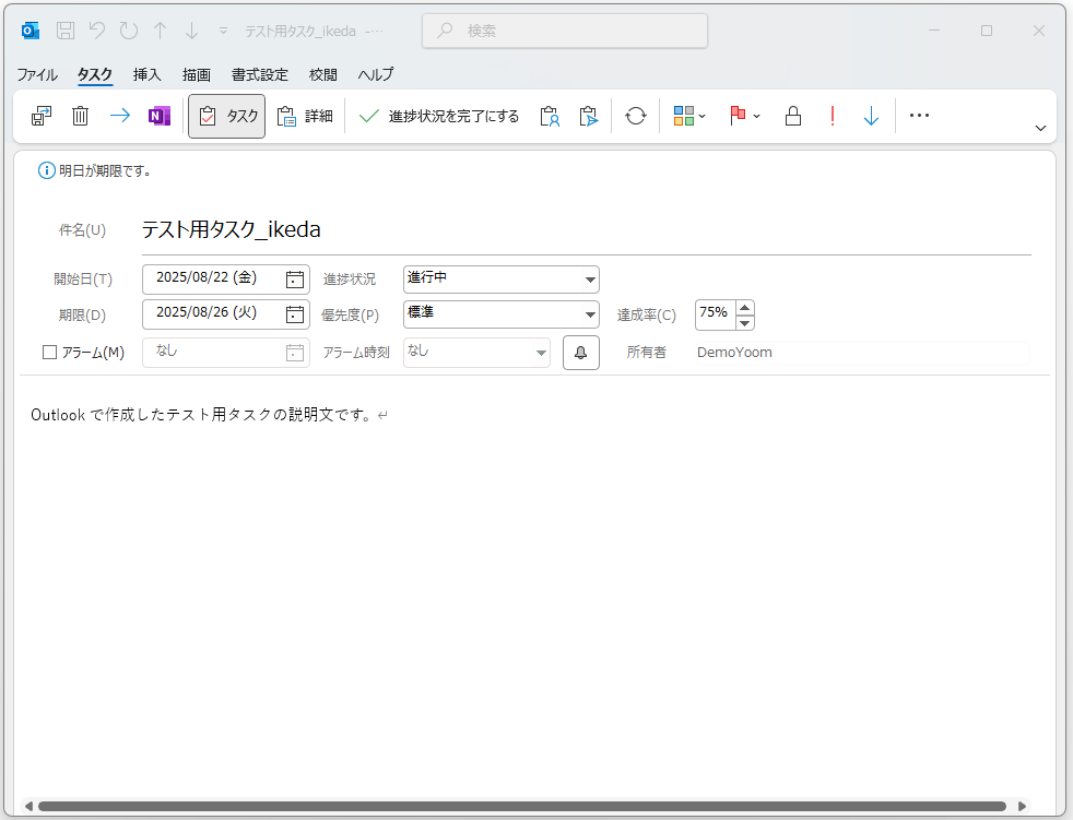 また、テストで使用するためOutlookに新規でタスクを作成しておきましょう。