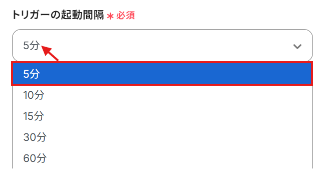 ・トリガーは5分、10分、15分、30分、60分の間隔で起動間隔を選択できます。