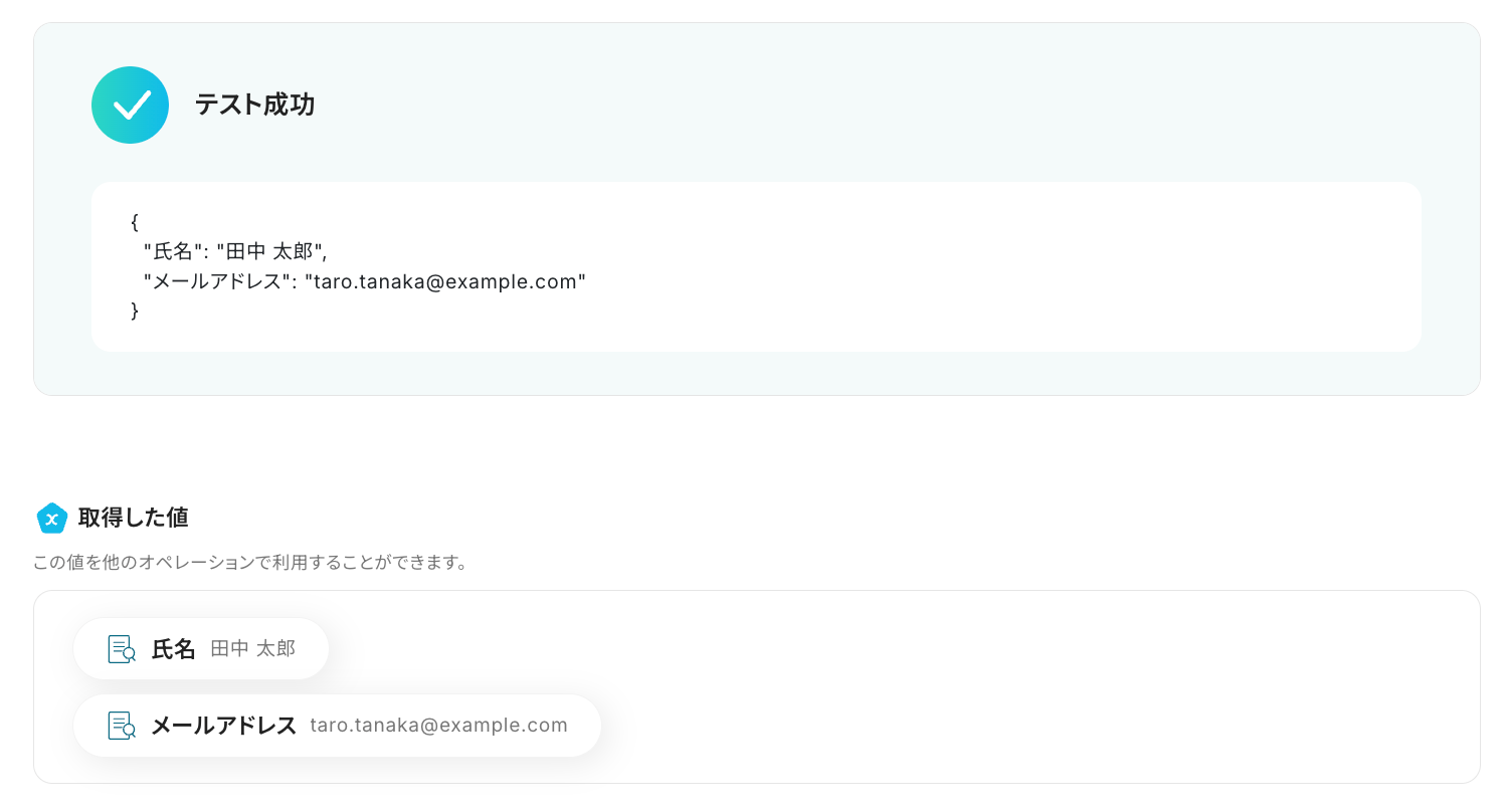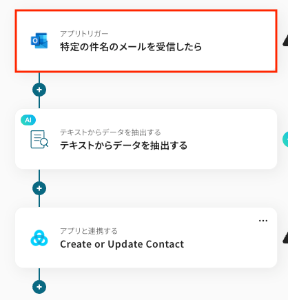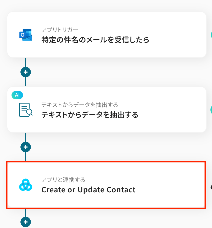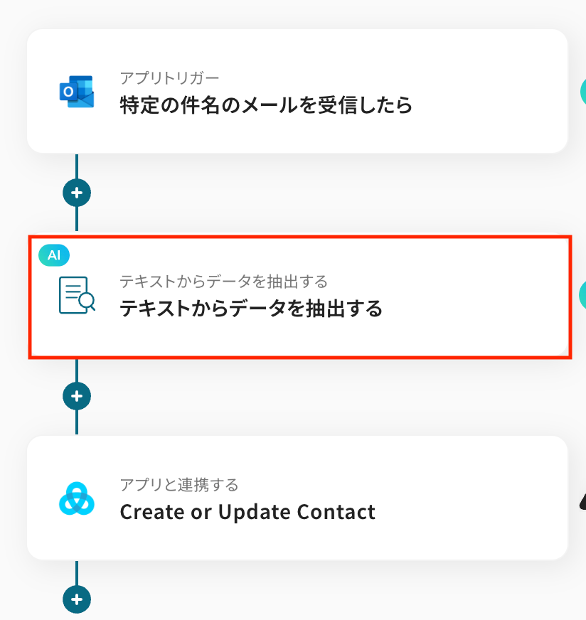 この連携フローには、メール本文から氏名や会社名などの特定情報を抽出する処理が含まれており、日々の顧客情報管理がより一層効率化可能です。