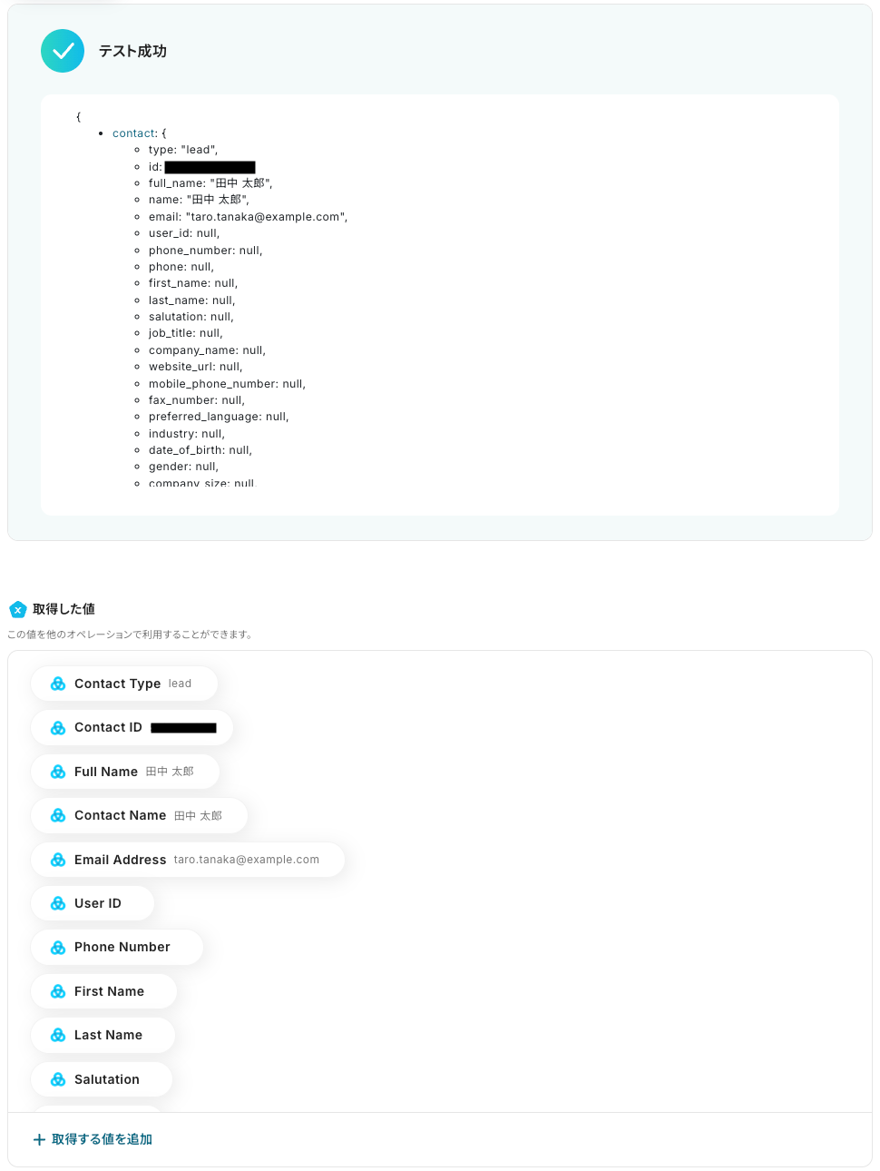 - Gistにコンタクトを作成する設定では、どの項目にどの情報を登録するかを、固定値や前段のオペレーションで取得した情報を利用して任意で設定してください。