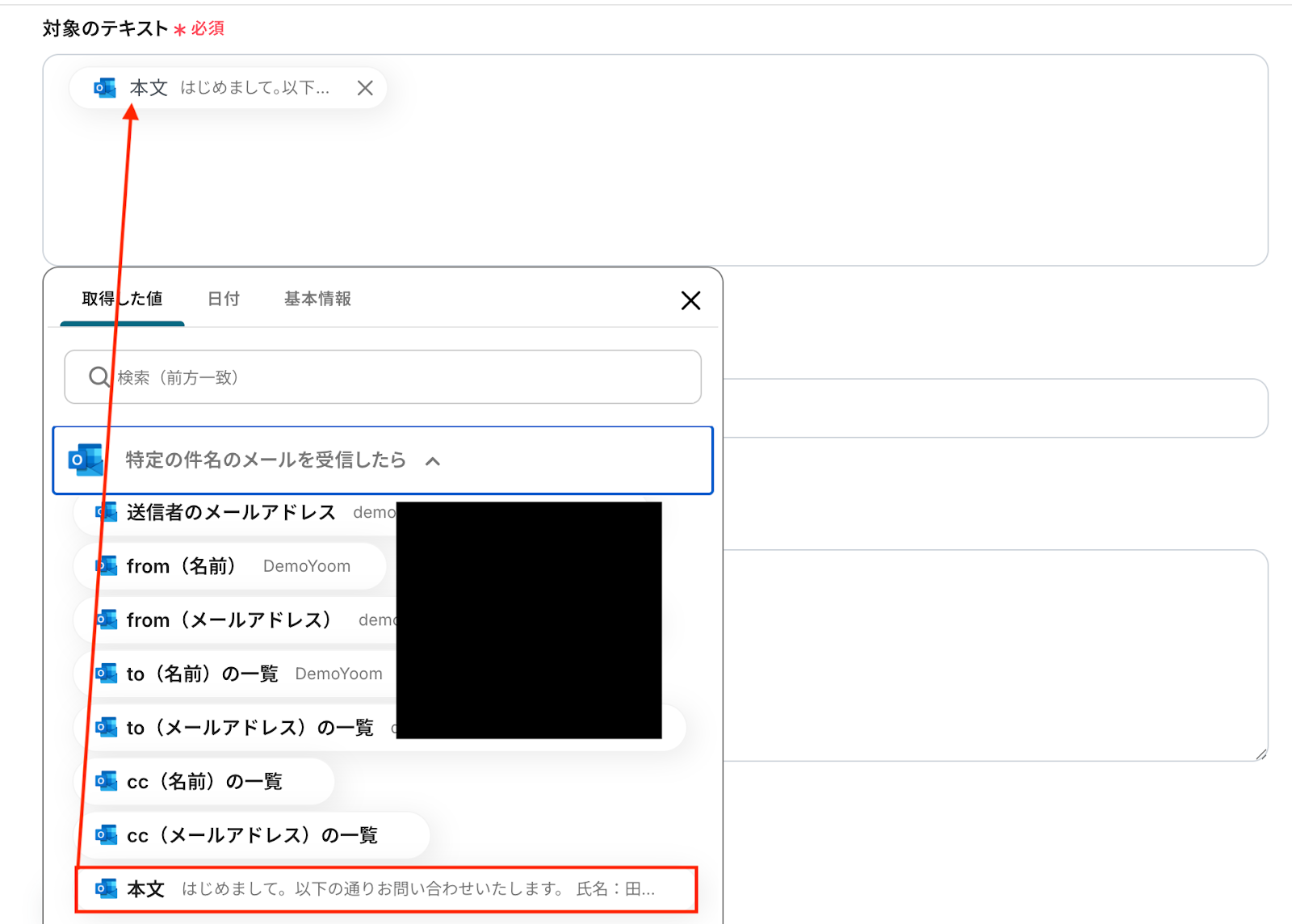 2.オペレーションは「特定の件名のメールを受信したら」、取得した値に「本文」を選択