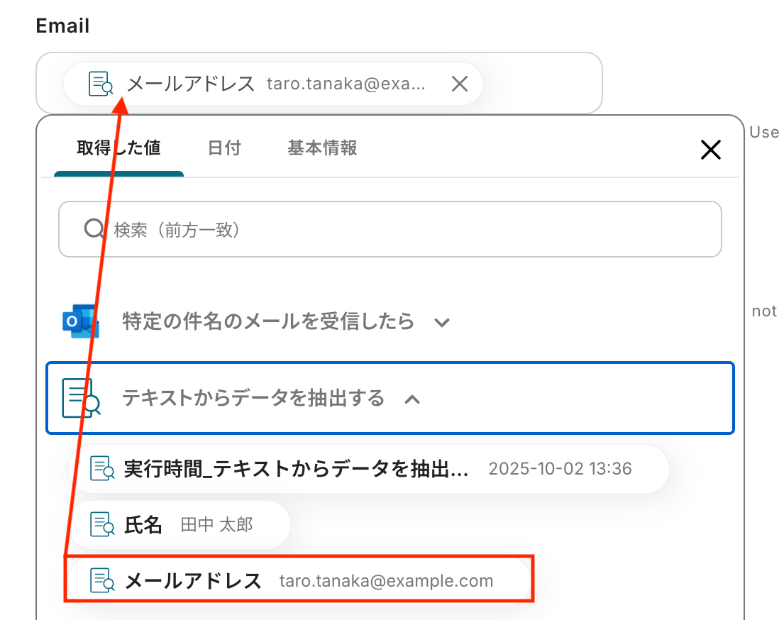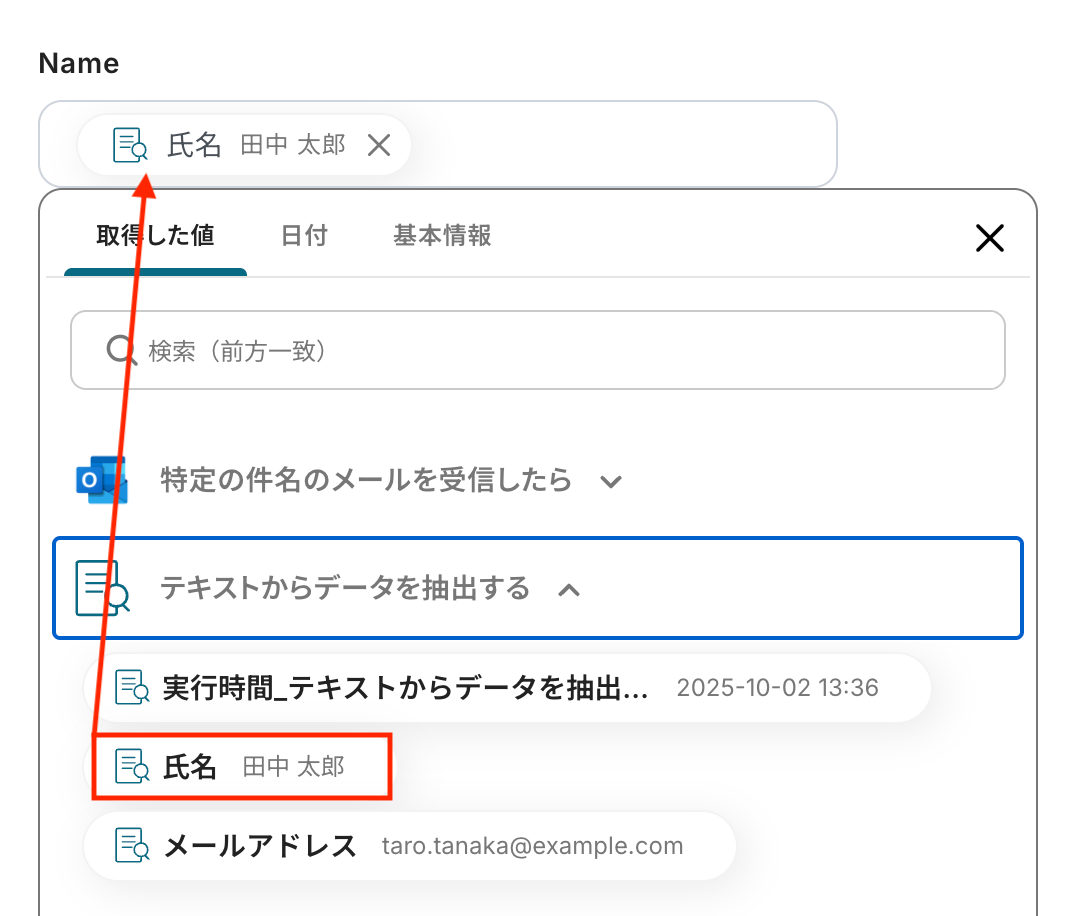 トリガーやオペレーション設定時に、「テスト」を実行して取得した値のことを指します。