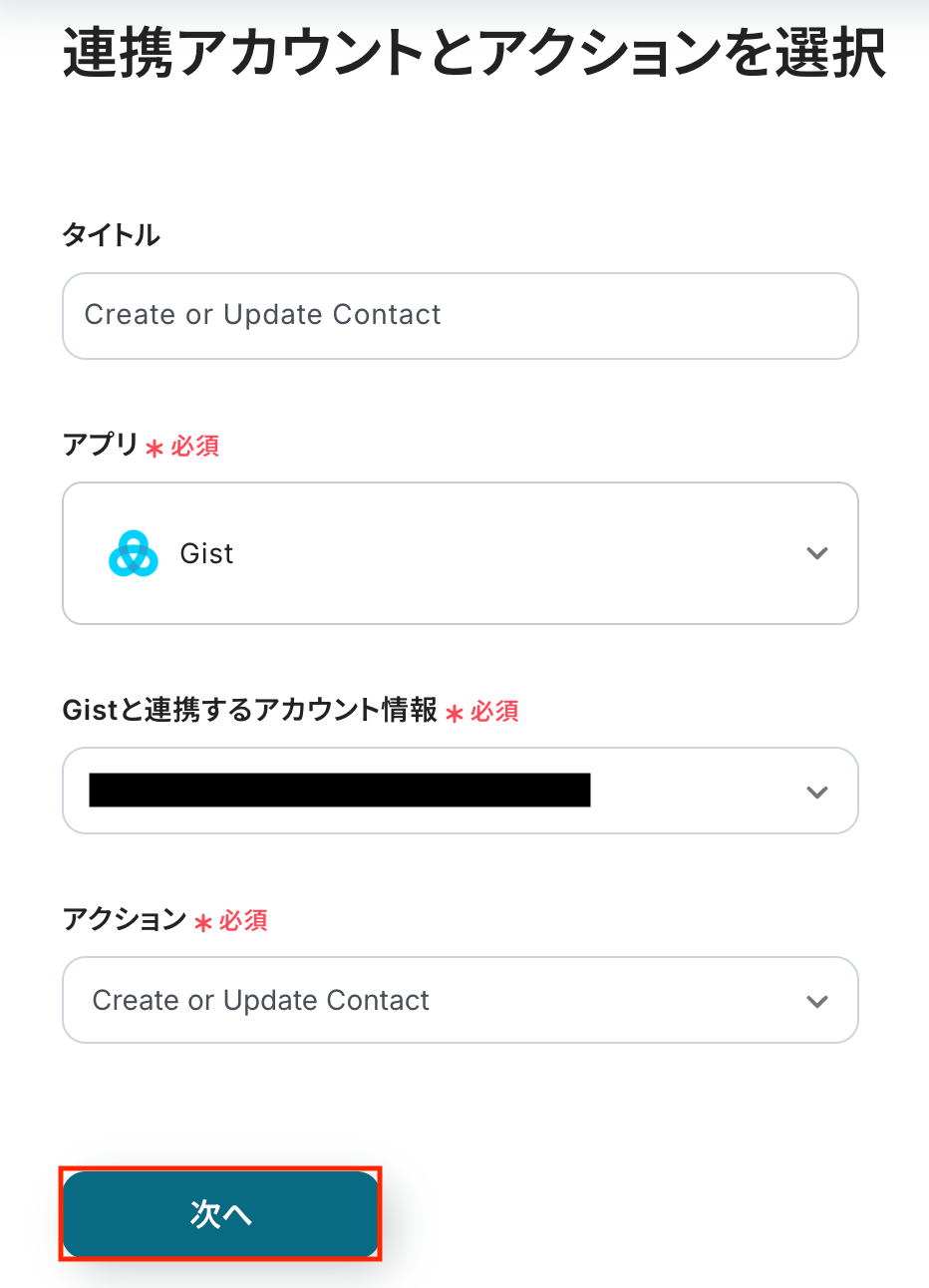 - 最後に、オペレーションでGistの「Create or Update Contact」アクションを設定し、抽出したデータを基にコンタクトを作成または更新します。