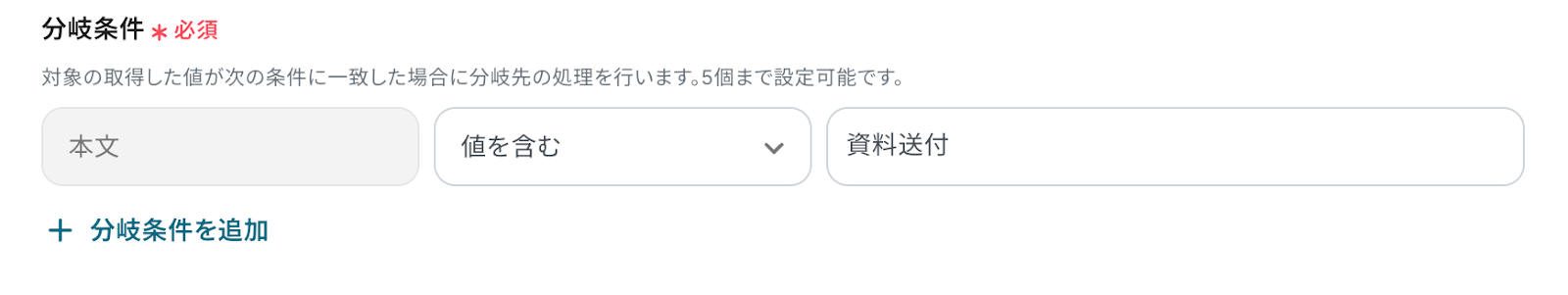 3.分岐条件を「本文に資料送付という値を含む場合」に設定