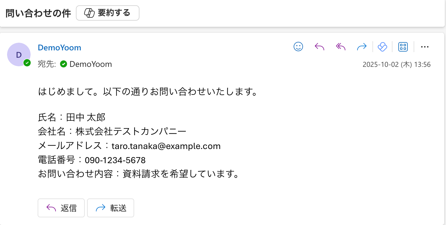 今回はテスト用に、件名に特定のキーワード「問い合わせ」を含む以下のメールを受信しました。