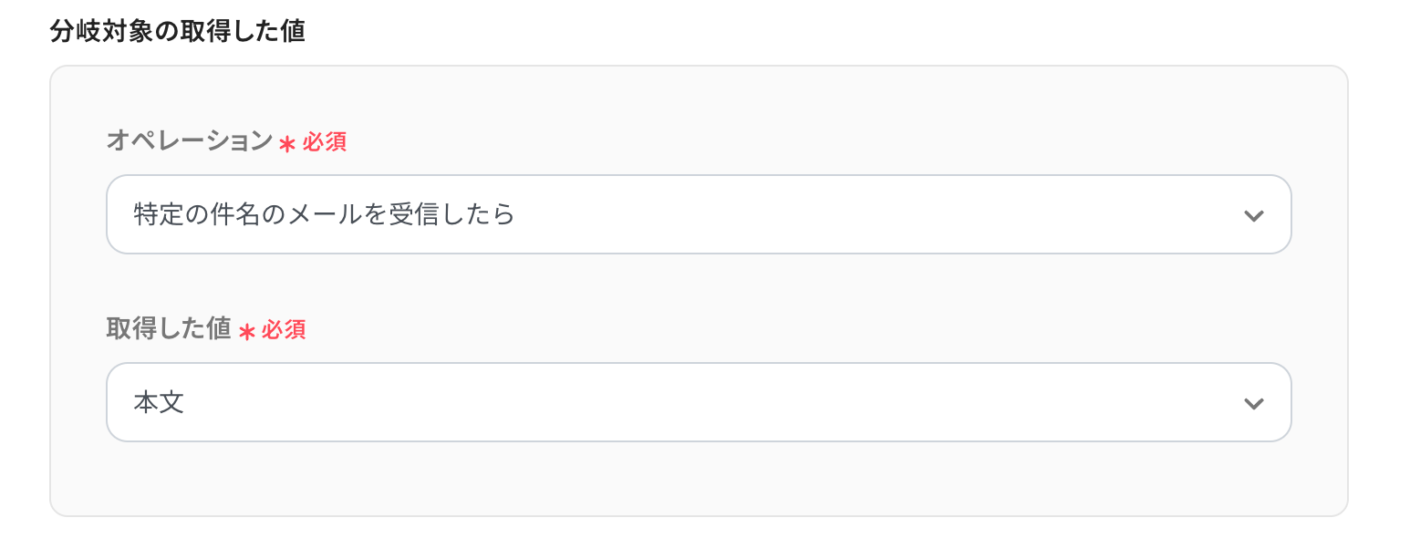 この設定により、本文に「資料送付」という値を含むメールを受け取った場合にのみ、フローボットが起動するように設定できます。
