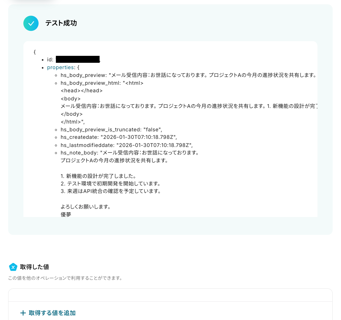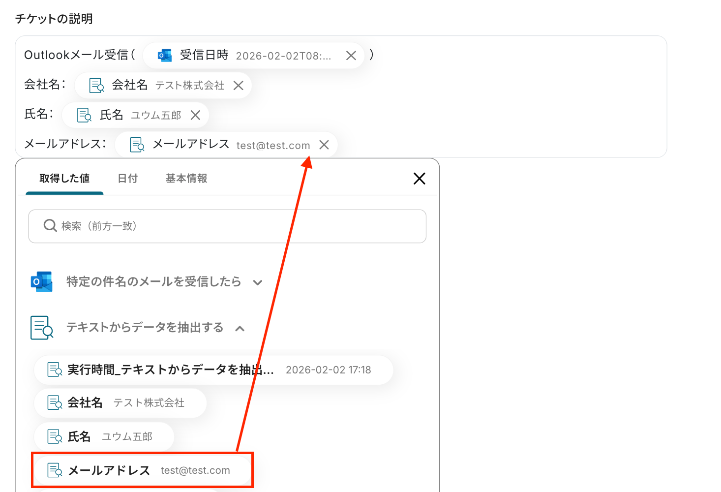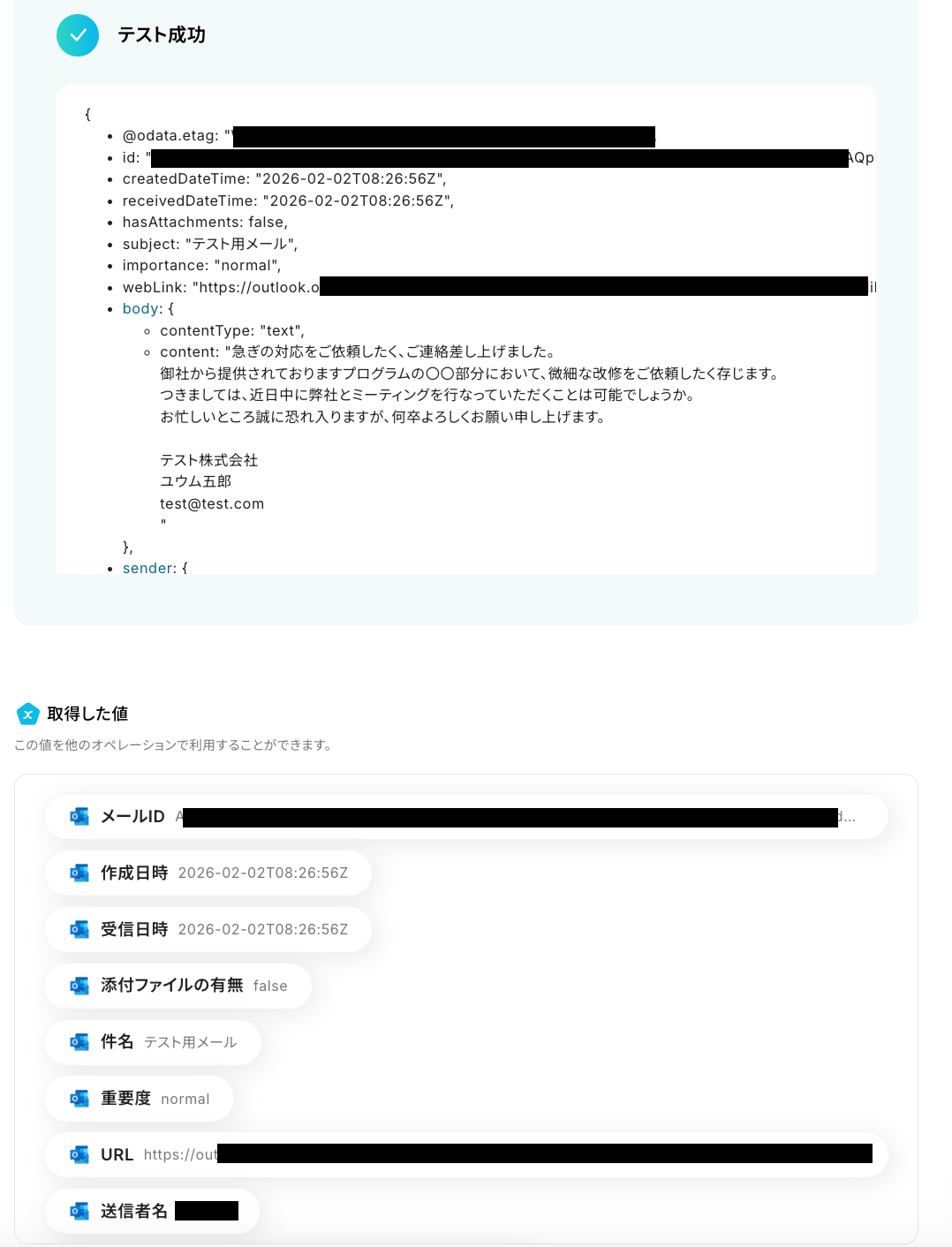 テストに成功すると、先ほどOutlookで受信した内容が取得した値に表示されます。