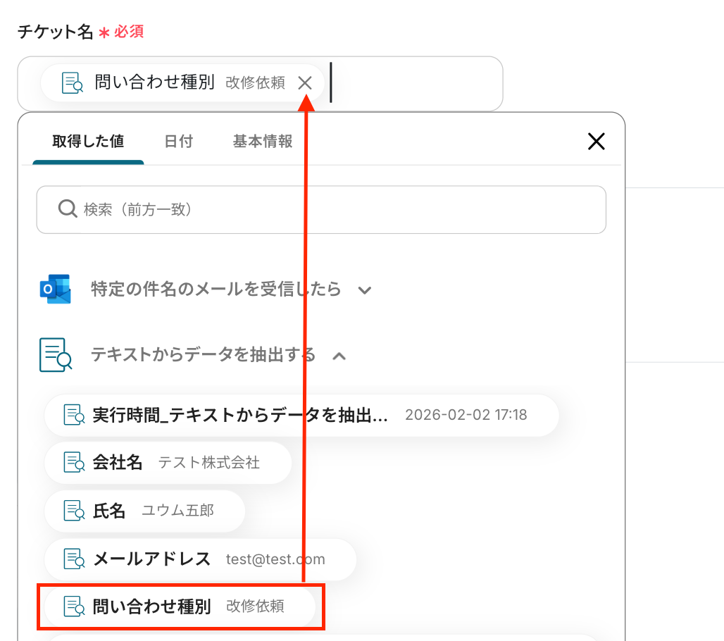 「チケット名」は、「テキストからデータを抽出」設定で取得した値から選択してください。