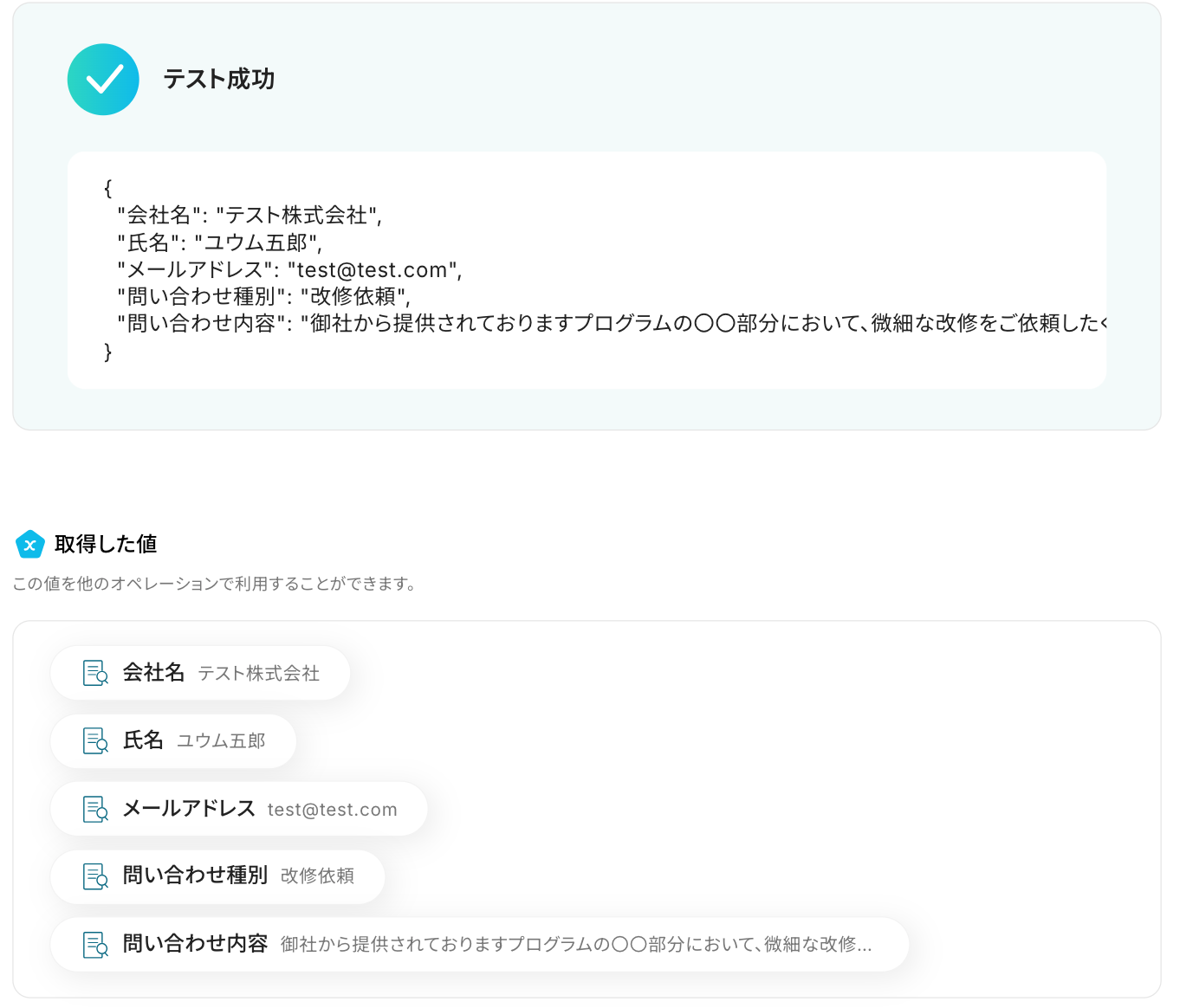 トリガーやオペレーション設定時に、「テスト」を実行して取得した値のことを指します。