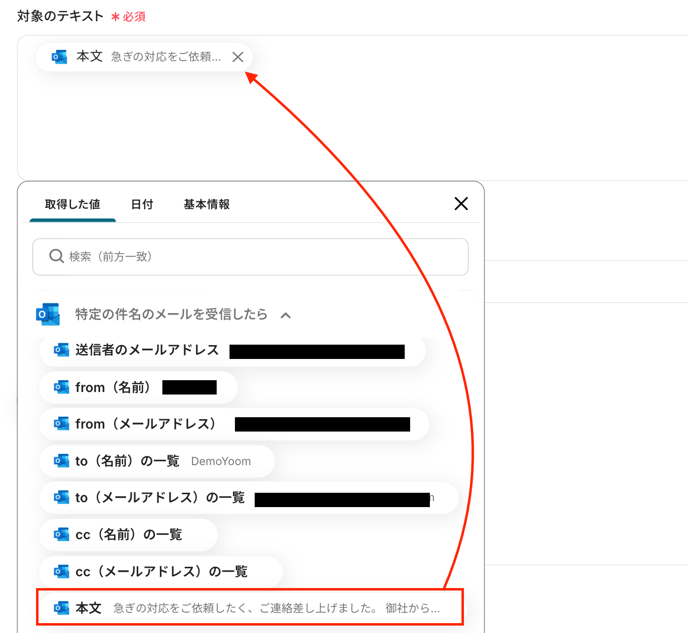 下図のように、Outlookのトリガー設定で取得した値を設定してください。