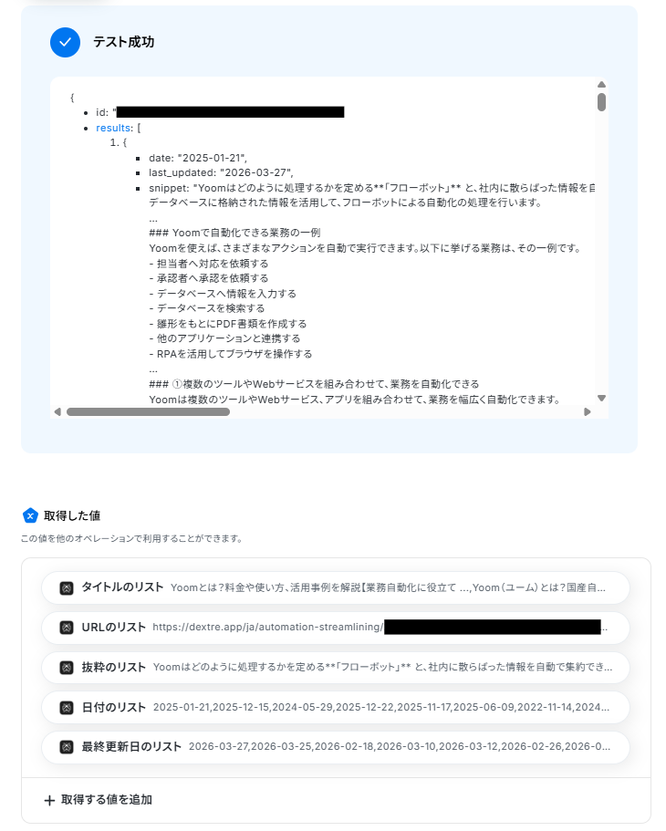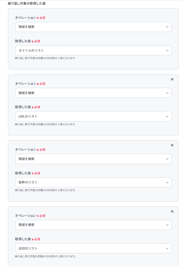 オペレーションと取得した値を設定します。 ここでは、タイトル、URL、抜粋、日付の各リストを繰り返し取得するように設定しています。 設定内容の確認ができたら、「完了」をクリックします。
