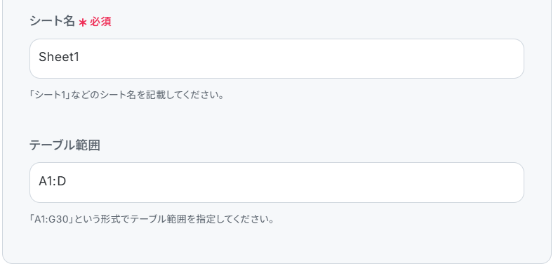 シート名も同様にボックスをクリックすると対象のシートが表示されるので、候補から選択してください。 テーブル範囲は以下のように設定しました。