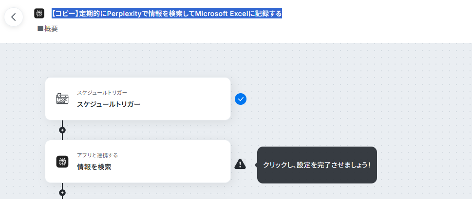 スケジュールトリガーでは、毎日、毎週、毎月など、情報収集を実行したい任意の頻度や時刻などを設定してください。 Perplexityで検索するアクションでは、調査したいキーワードなどを検索クエリとして任意で設定してください。 Microsoft Excelに連携するアクションでは、Perplexityの検索結果からどの情報をどの列に記録するかを任意で設定してください。 ■注意事項