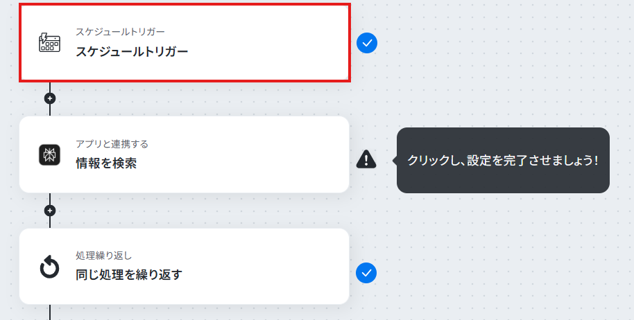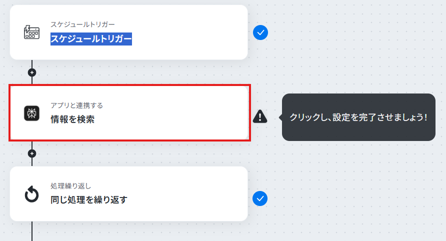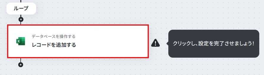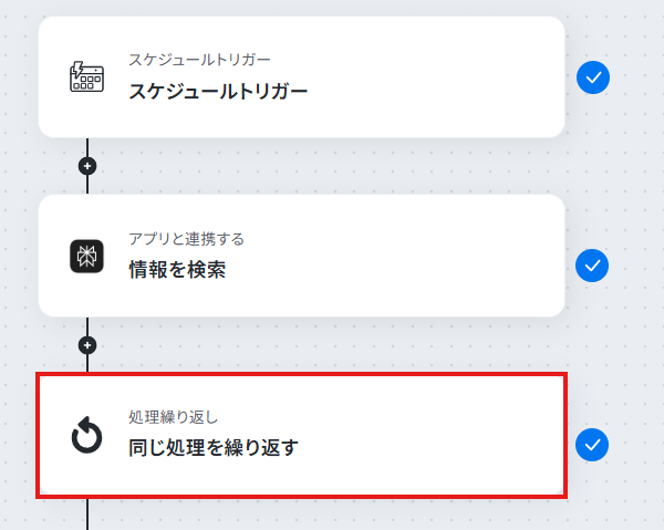 ステップ5:同じ処理を繰り返す設定 フローに戻り、「同じ処理を繰り返す」のアイコンをクリックします。「同じ処理を繰り返す」の設定方法 もあわせてご確認ください。 ※「同じ処理を繰り返す」オペレーションを使う場合は、チームプランまたはサクセスプランが必要です。フリープラン・ミニプランだと、そのオペレーションやデータコネクトを設定してもエラーになってしまうのでご注意ください。 チームプランやサクセスプランなどの有料プランには、2週間の無料トライアルがついています。トライアル期間中は、通常は制限されるアプリや機能(オペレーション)も問題なく使えるので、この機会にぜひお試しください。
