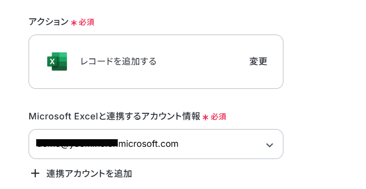 ステップ6:Microsoft Excelへレコードを追加する設定 Microsoft Excelへレコードを追加するアクションを設定します。