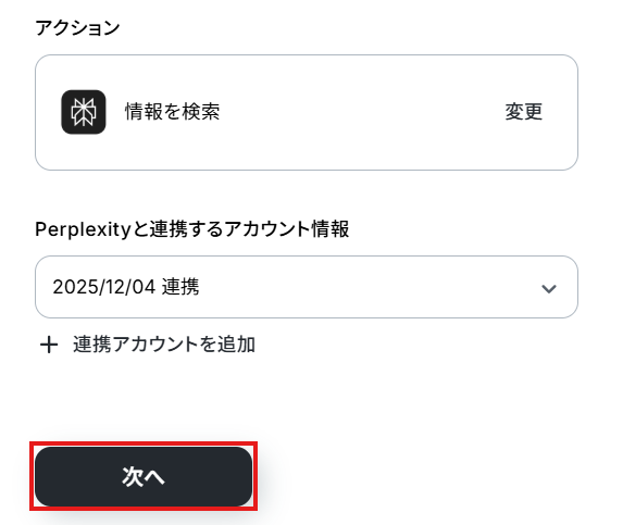 ステップ4:Perplexityの情報を検索する設定 次にPerplexityの情報を検索するアクションを設定していきます。 フローに戻り、「情報を検索」をクリックしてください。