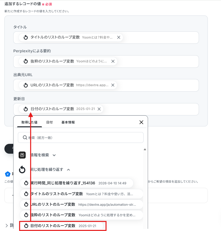 追加するレコードの値を入力します。 以下のように、取得した値のループ変数から設定しましょう。取得した値を活用することで固定値ではなく、トリガーが実行されるたびに最新の情報が反映できます。
