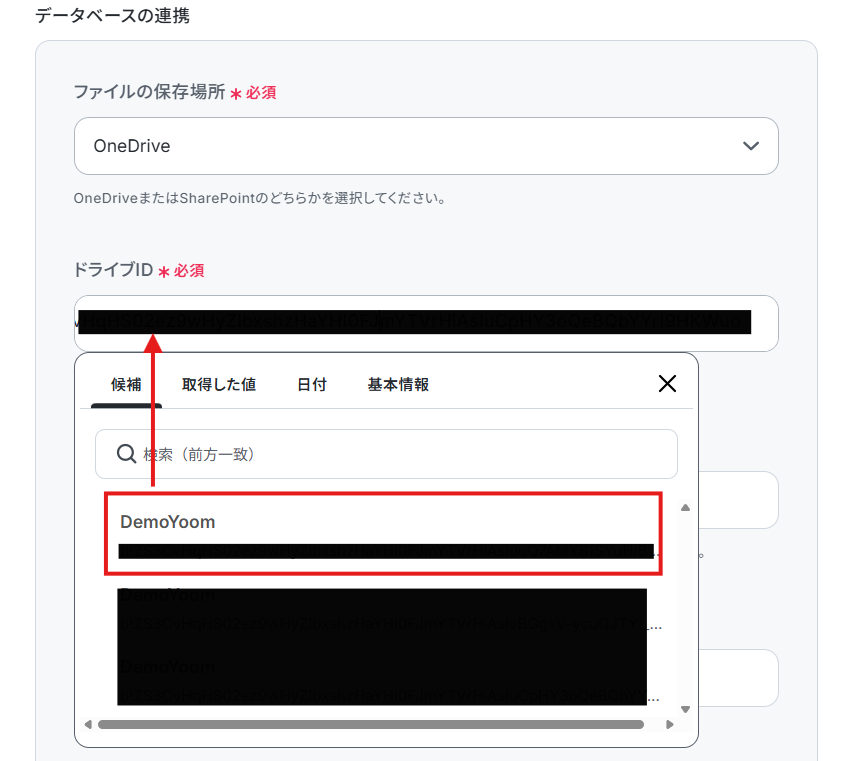続いてドライブIDとアイテムIDを入力します。 ドライブIDはボックスをクリックすると連携済みのIDが表示されるので候補から選択してください。