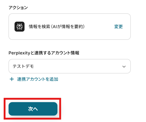 アクションはデフォルト設定のまま、アカウント情報は、連携したいアカウントが選択されているか確認してください。確認出来たら「次へ」をクリックしましょう。