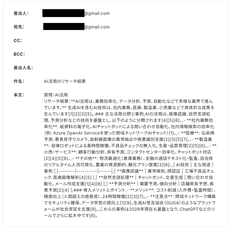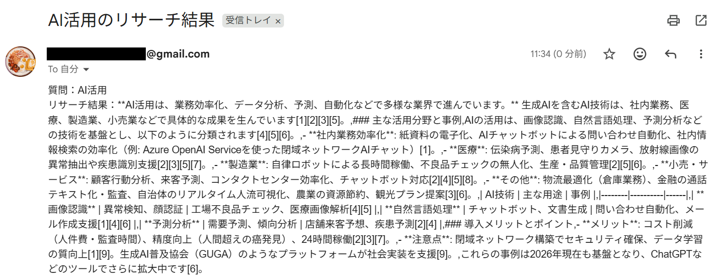 もし、Perplexityでの検索結果や関連情報を自動的にGmailで送信する仕組み があれば、こうした定型的なリサーチや報告業務から解放されますよね。