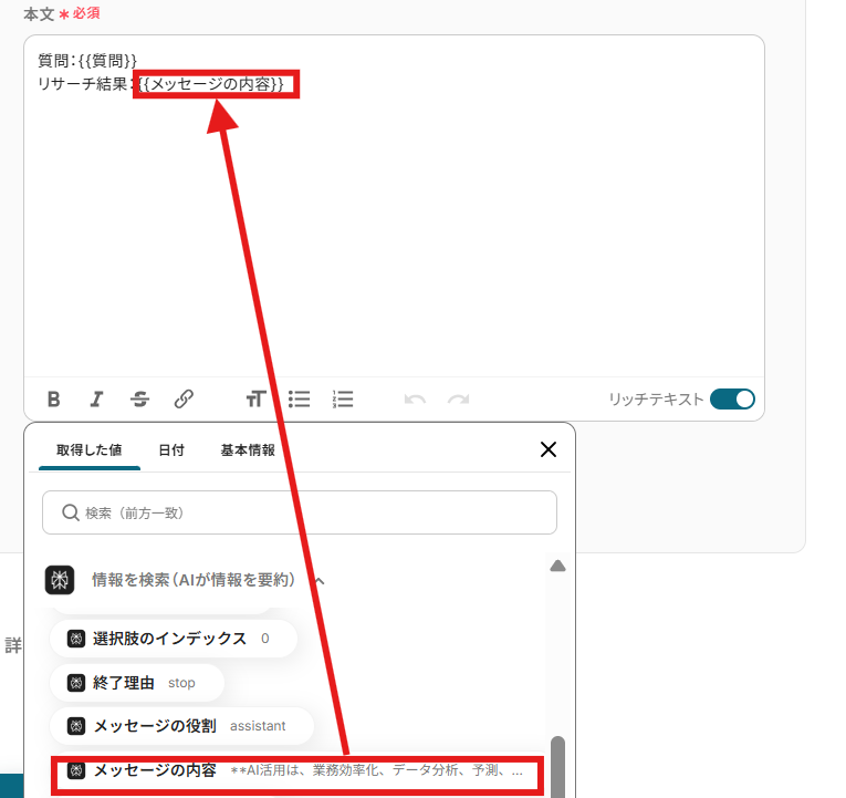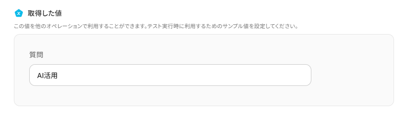 ※取得した値とは? 取得した値とは、トリガーやオペレーション設定時に、「テスト」を実行して取得した値のことを指します。 取得した値は、後続のオペレーション設定時の値として利用でき、フローボットを起動する度に、変動した値となります。詳しくは以下をご覧ください。