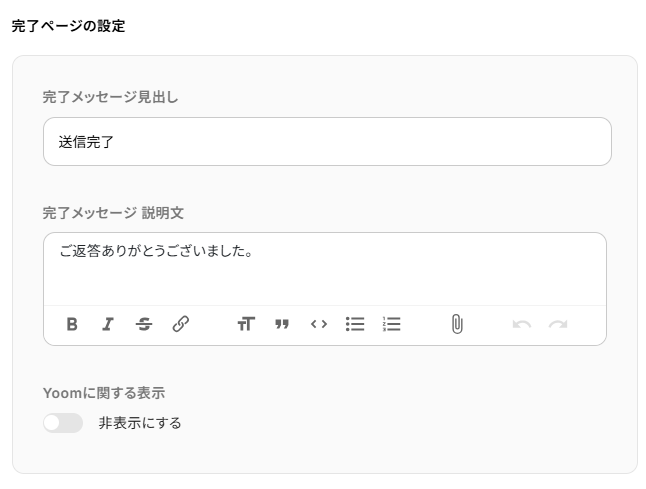 完了ページはフォーム回答が完了したときに出てくるサンクスページです。お好きな内容で登録してください。今回は以下のように設定しました。