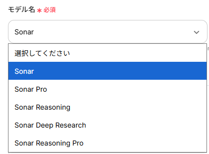 AIのモデルを選択してください。今回は「Sonar」にしました。